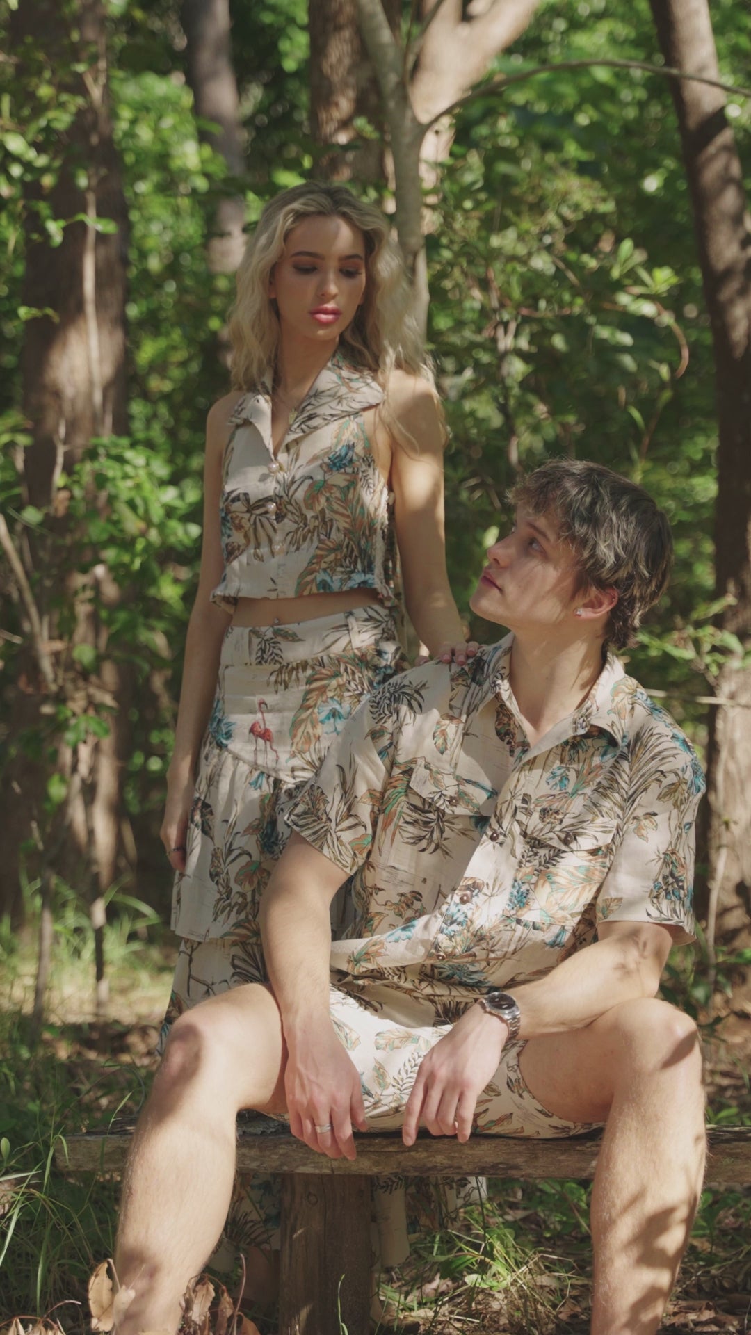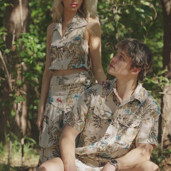 The Bruce shirt is a revamp on the classic short sleeve shirt with pockets. This design is a nod to the fashion of the 1950s with a few modern twists like the French seam detail that elongates the body and use of limited edition 100% organic tropical floral print linen we have named Palm Springs.