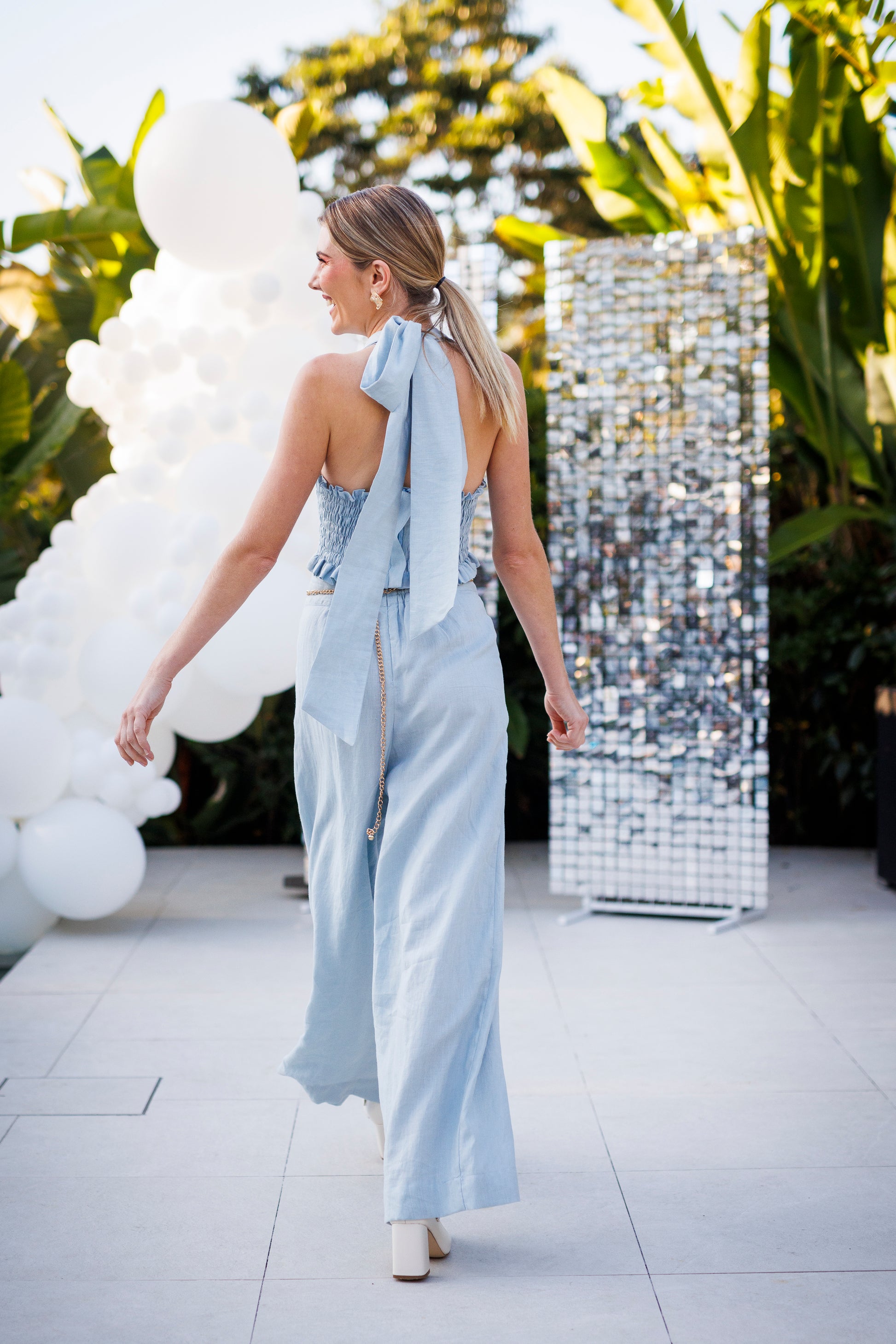 Made using a luxe 100% organic sky blue linen which is breathable and comfortable to wear.