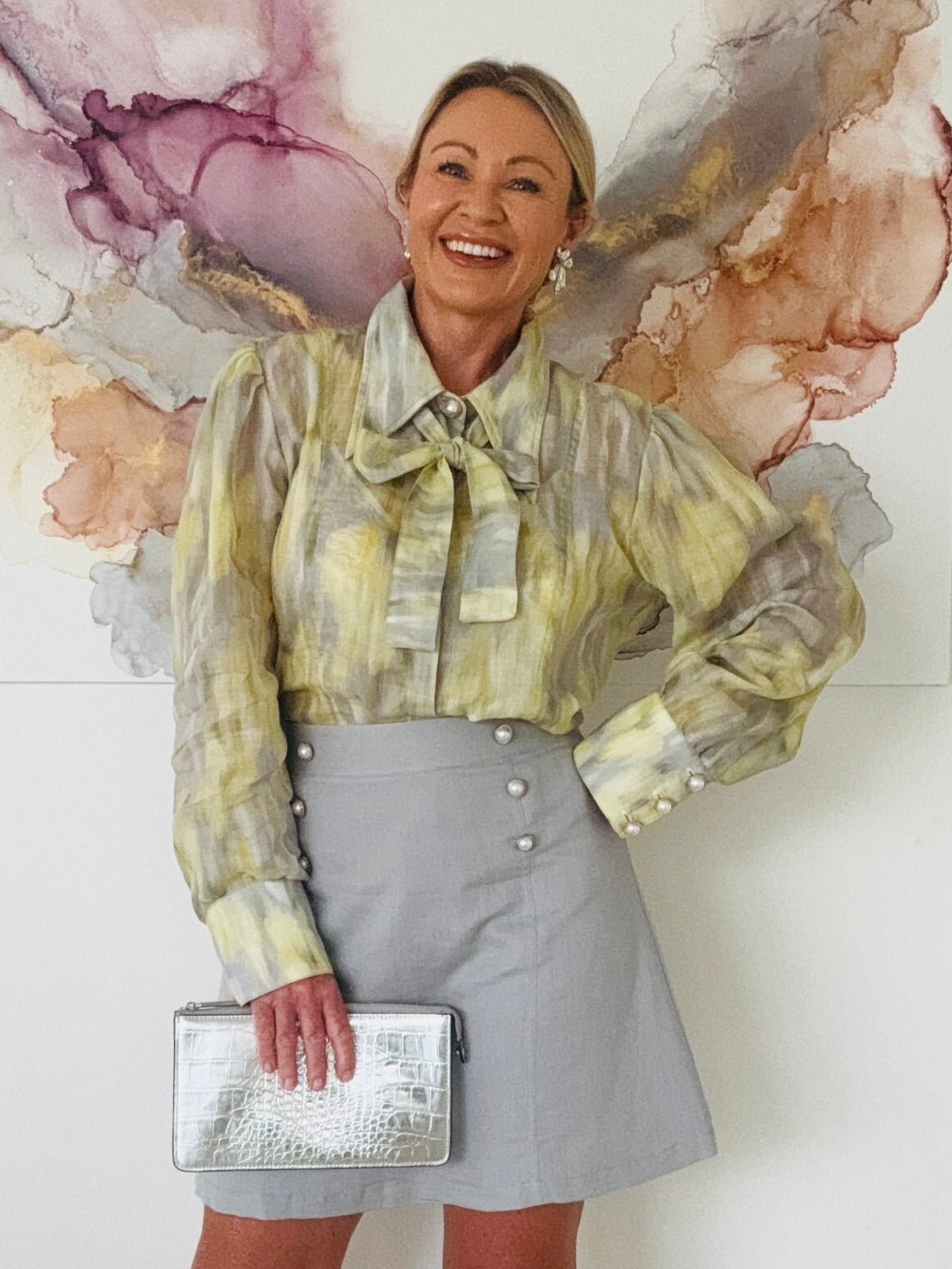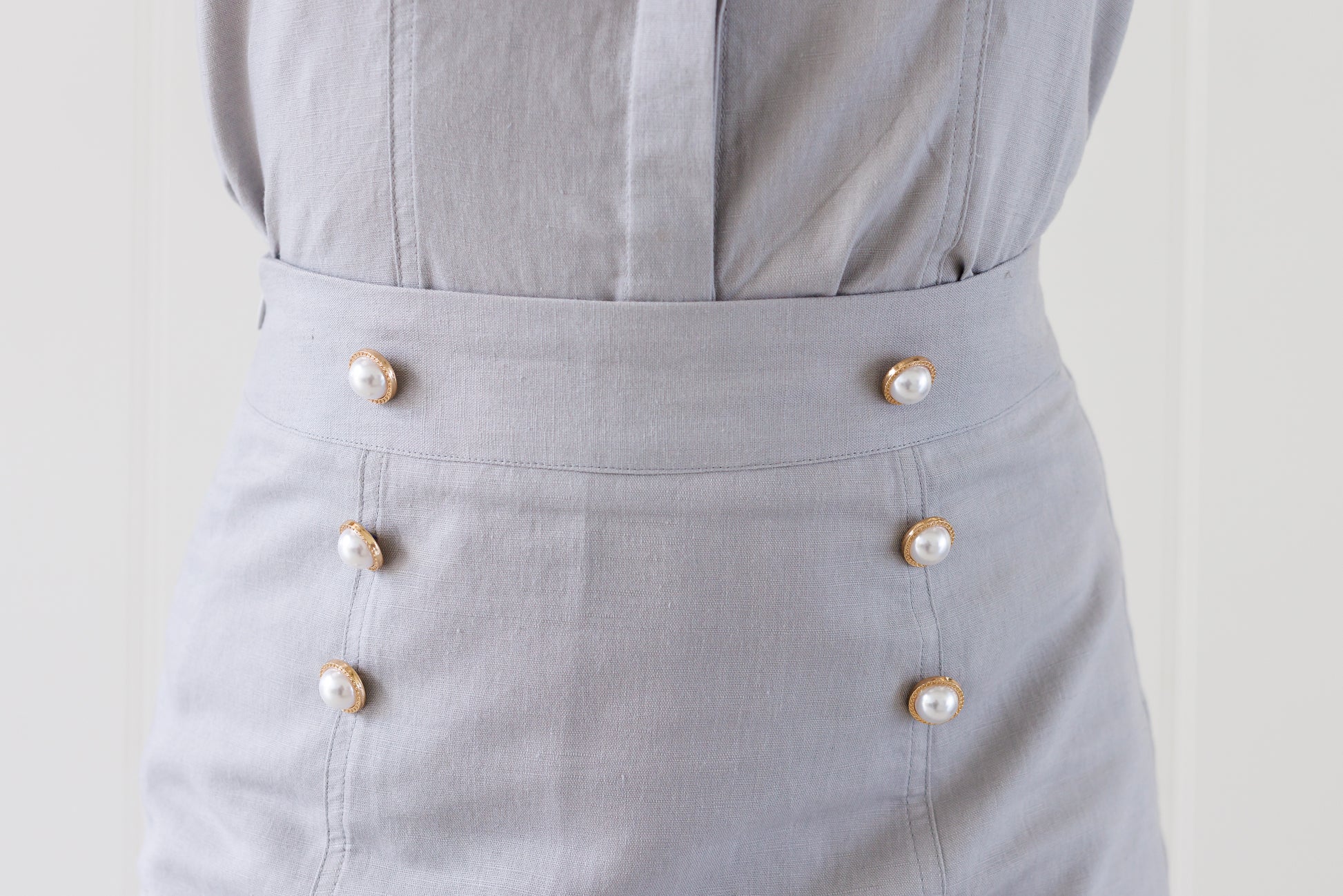 The Dawn mini skirt is an A-line mini with antique inspired pearl feature buttons.