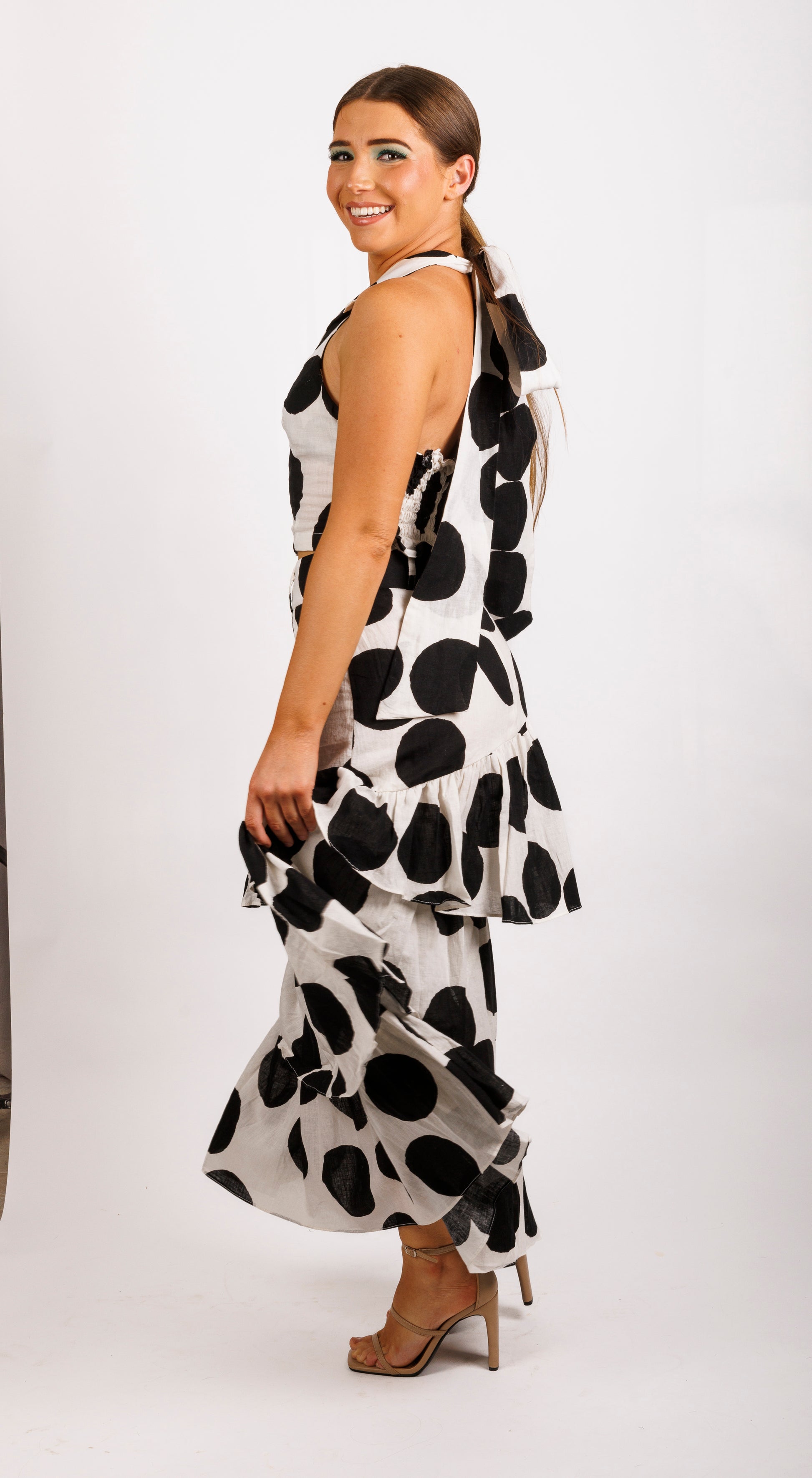 The Ivy Halter Neck Top offers an exaggerated collar, shirred back with three feature buttons.