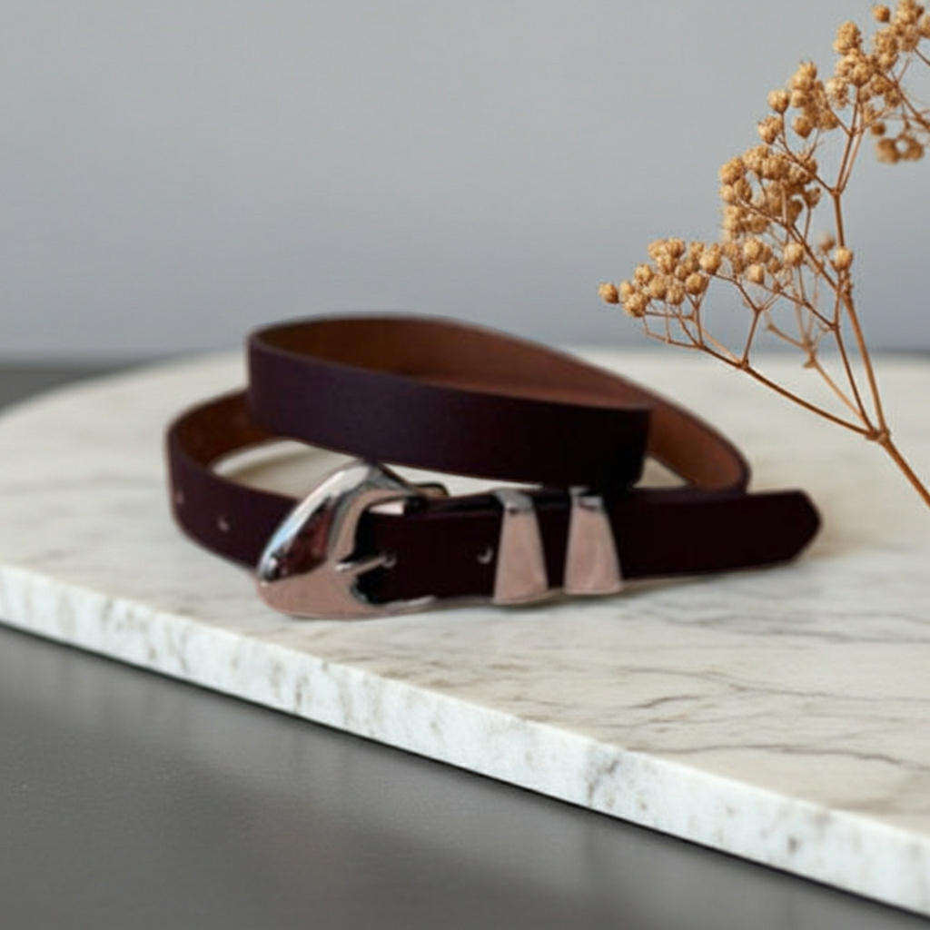 Classic sophistication meets modern edge. Made from rich chocolate-brown vegan leather, this belt is finished with a bold silver dome buckle that catches the light with understated shine. Smooth, durable, it’s designed to complement both casual and polished looks.