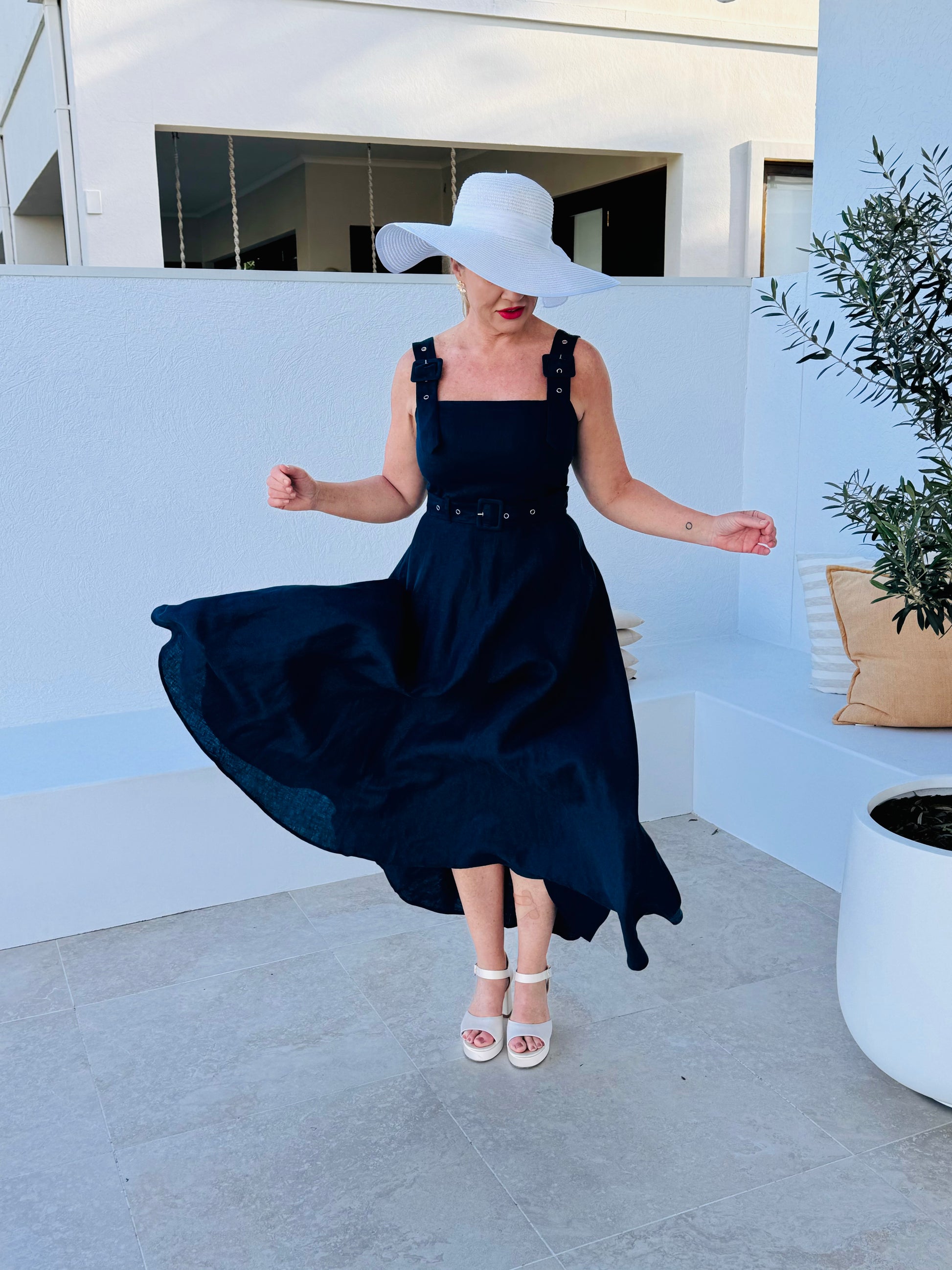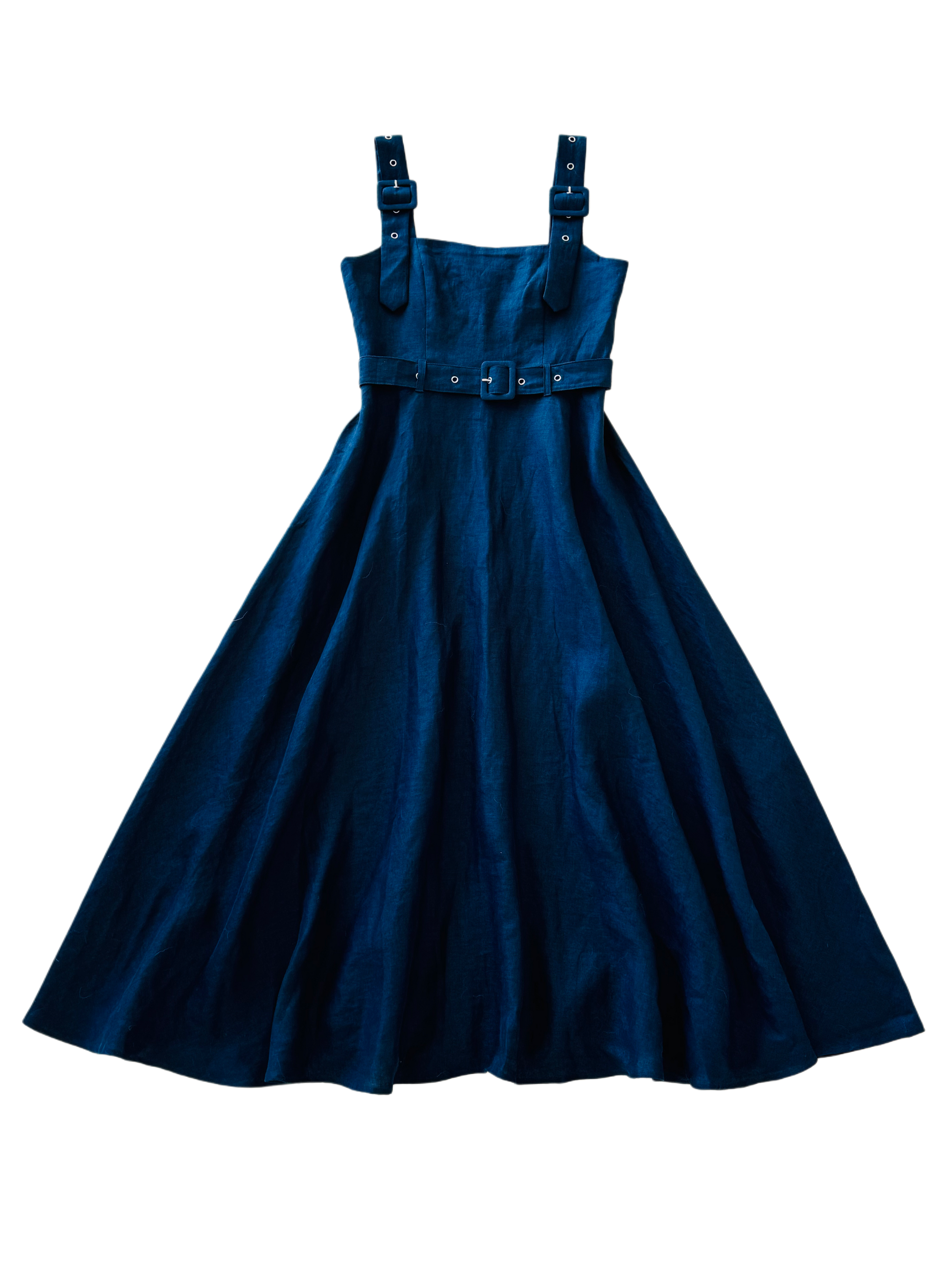 The dress features a full skirt and fitted bustier with adjustable shoulder straps featuring a statement buckle and matching fabric belt.