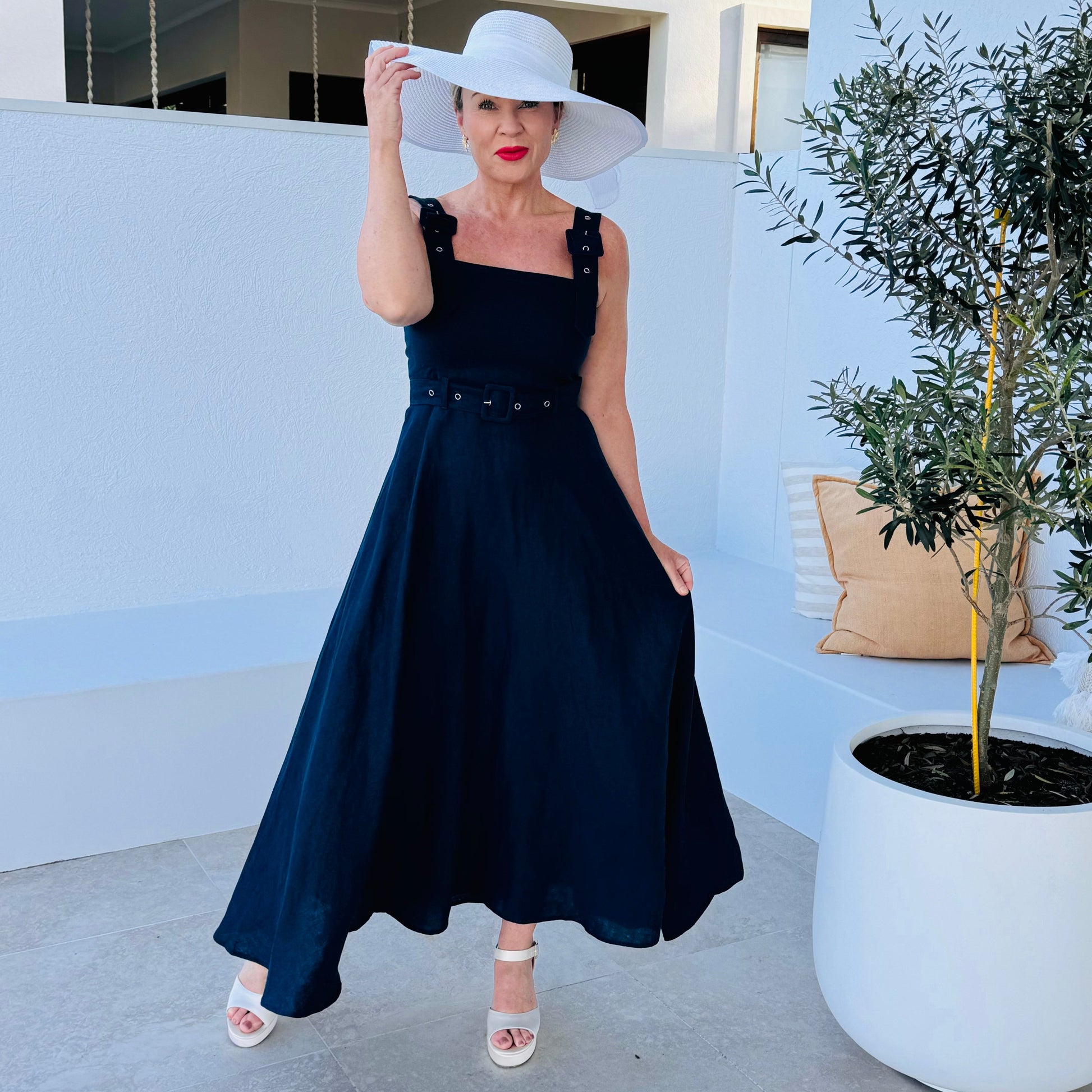 The Joy dress is a maxi dress made using 100% recycled linen in baby blue.