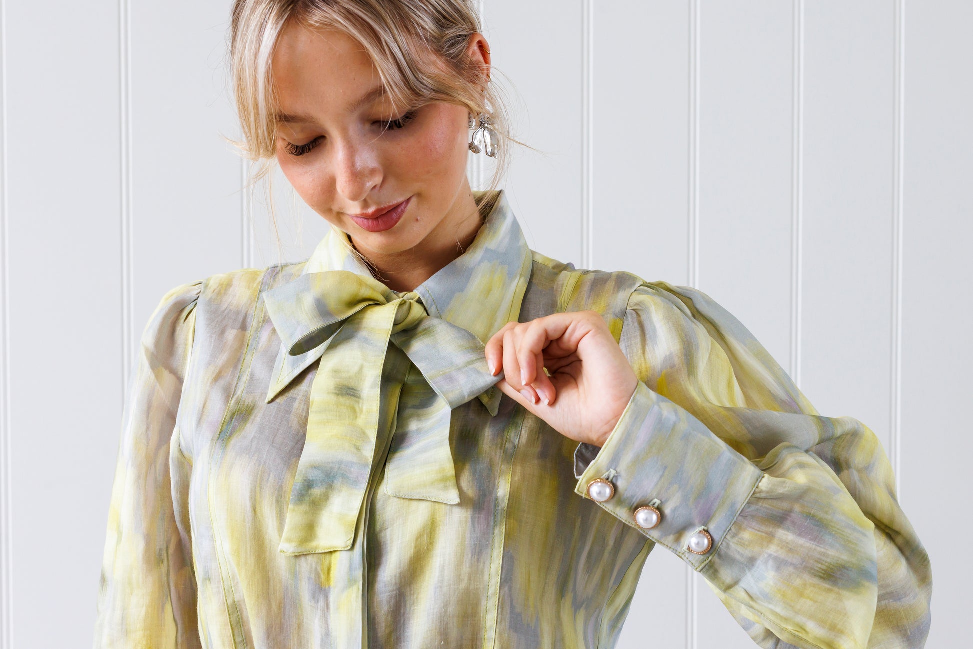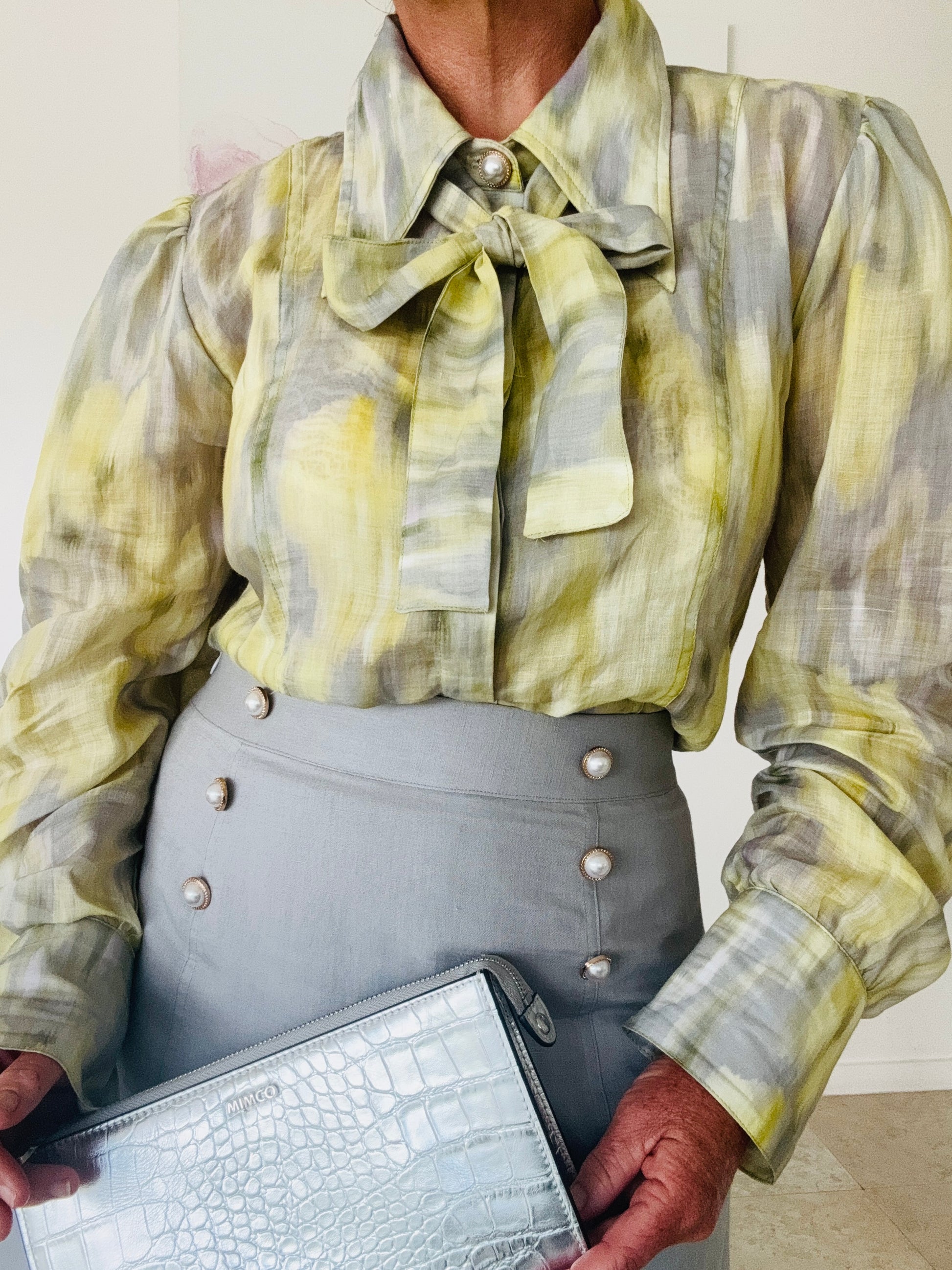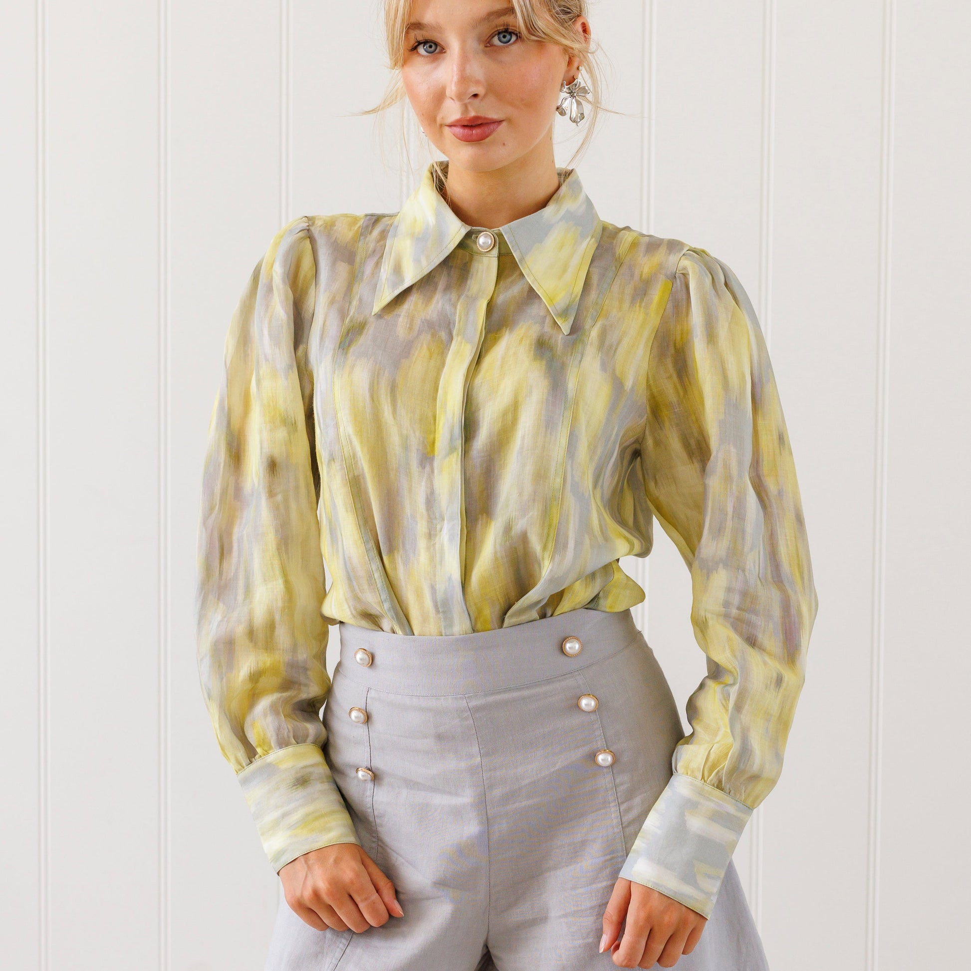 The Marilyn shirt has a bishop sleeve with large cuff featuring three antique pearl inspired buttons, an exaggerated collar with feature button at top and removable tie.