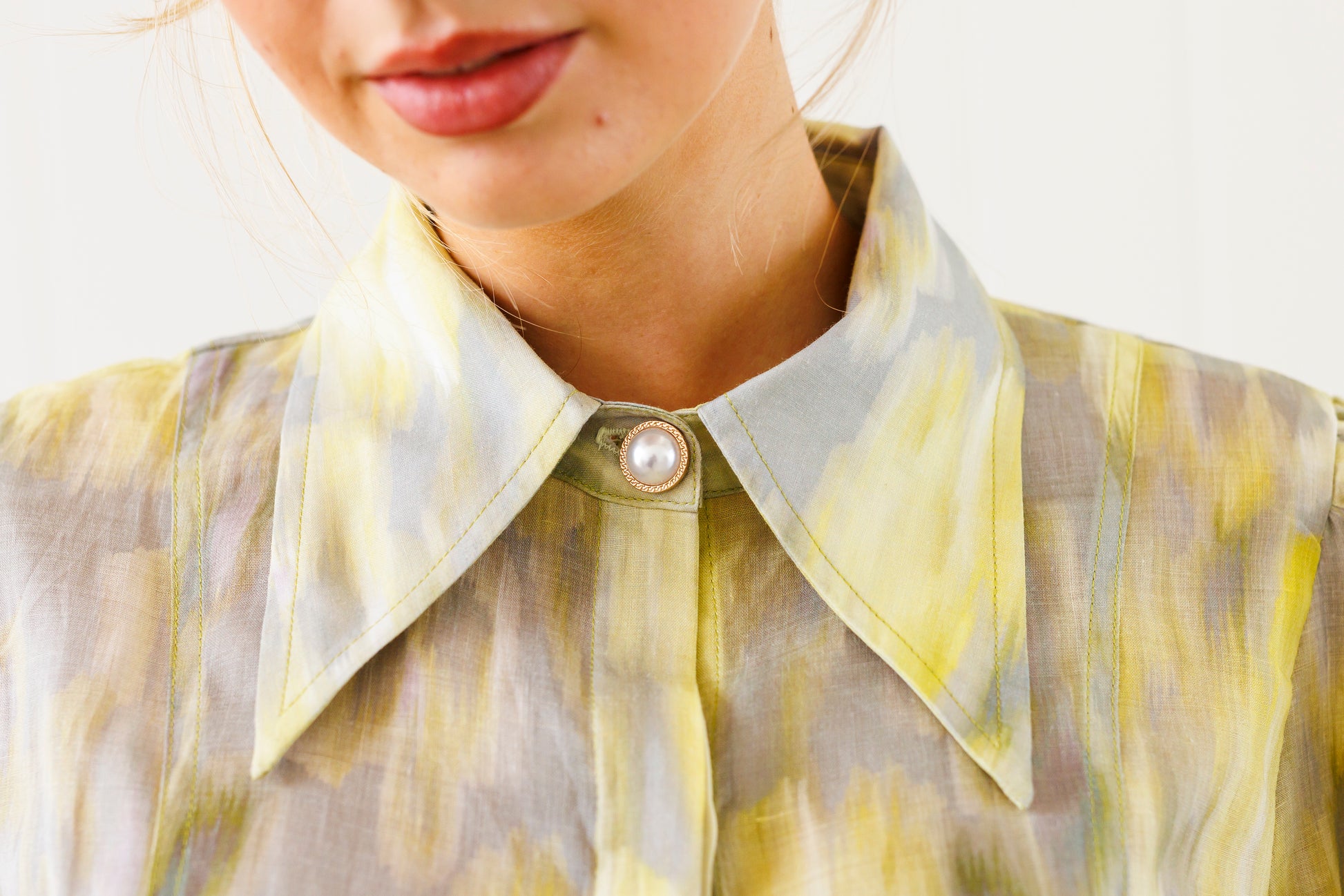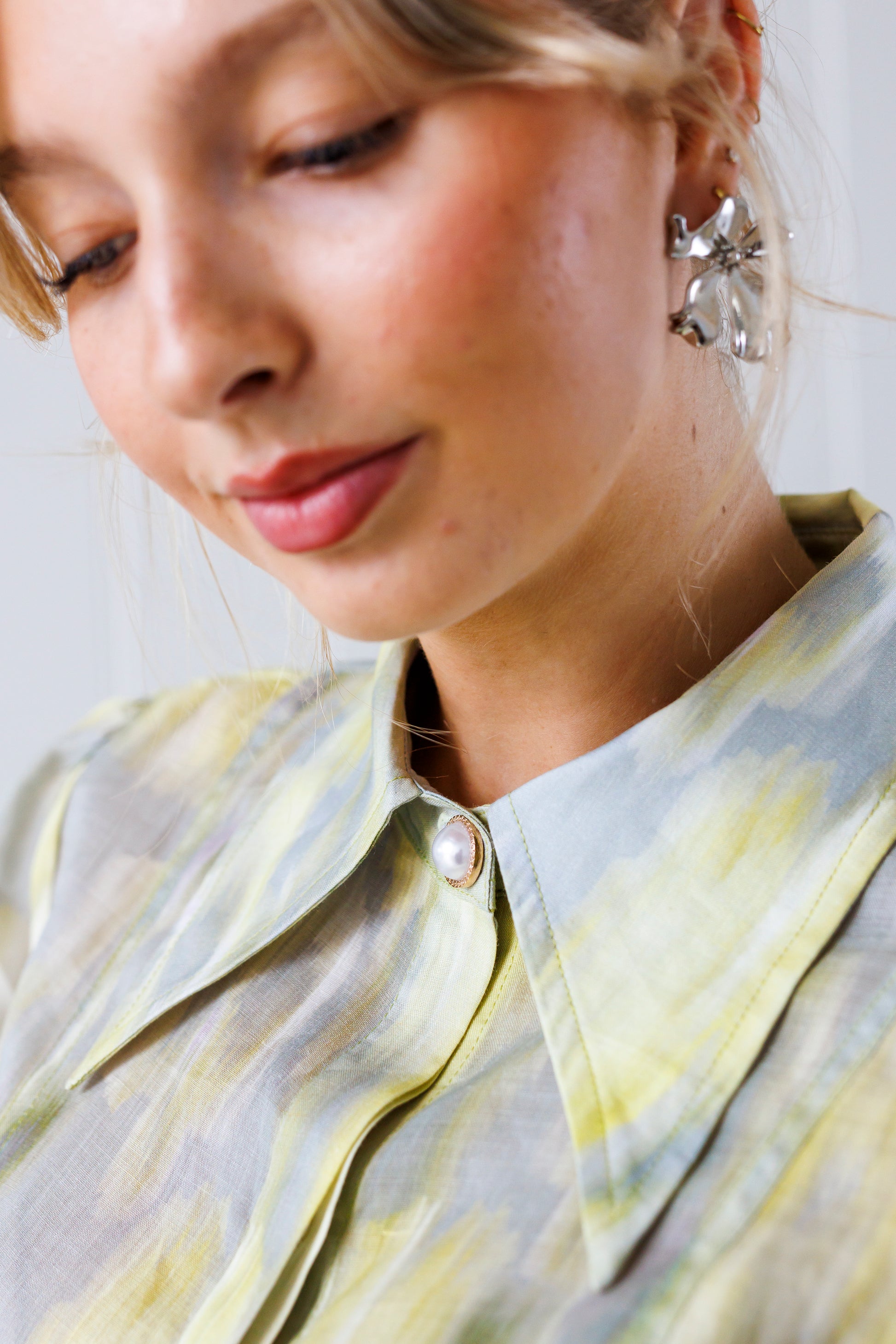 The watercolour print in buttery yellow, lemon, grey and lilac is a fresh take on summer colour that pairs beautifully with grey, whites and metallics.